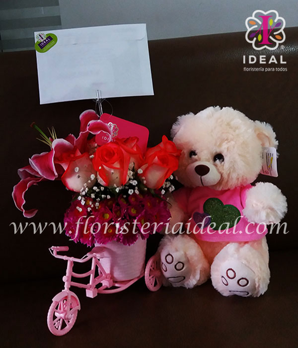 as latir el corazon de tu linda dama con este tierno regalo elaborado con bellas rosas y lindo lirio su base es una bicicleta y esta acompañado de bello osito de peluche y tarjeta a computador para esprezar el mas lindo agradecimiento de traer un ser querido a este mundo.