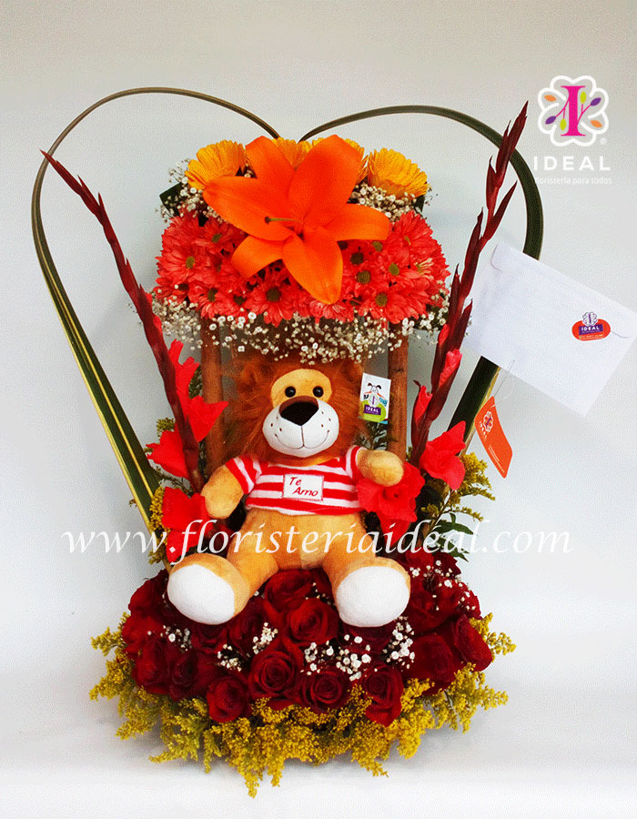 "ARREGLO CON PELUCHE" elaborado con hermosas rosas, lirio,gerberas, gladiolos, y margarita acompañado de tierna tarjeta para esta esperada ocasión. (este bello peluche es antialérgico de 28 cm)
