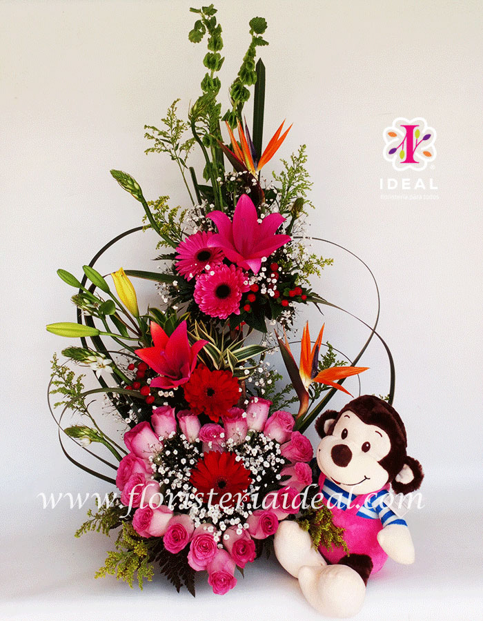 Tierno y delicado arreglo de flores elaborado en bellas rosas, lirios, gerberas,aves del paraíso y delicados follajes esta acompañado de hermoso peluche antialergico y tarjeta para esta especial ocasión.