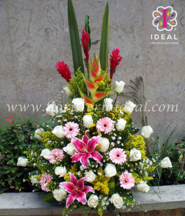 Lindo y delicado ramo en rosas blancas gérberas, lirios y yinyes. Ideal para decorar un ambiente de pureza para la llegada de tu bebé