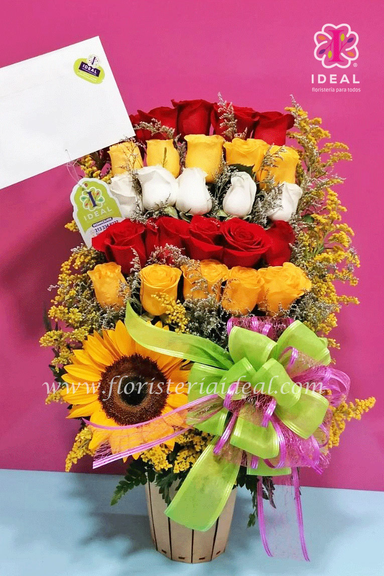 Arreglo floral en forma de escalera elaborado en rosas surtidas, viene acompañado por moño y tarjeta para la ocasión