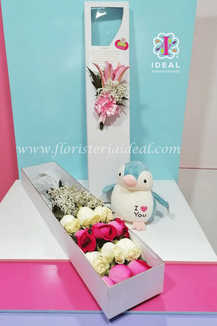 Linda caja alargada de rosas acompañado por delicado follaje y tierno peluche.Cantidad de rosas: 12 unidades