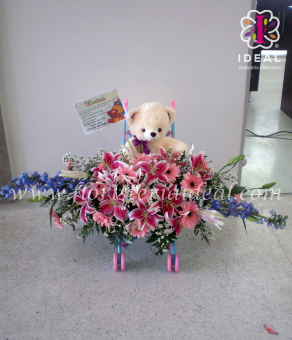 Carrito decorado con rosas, gérberas y un tierno peluche. Una linda creación para tu bebe