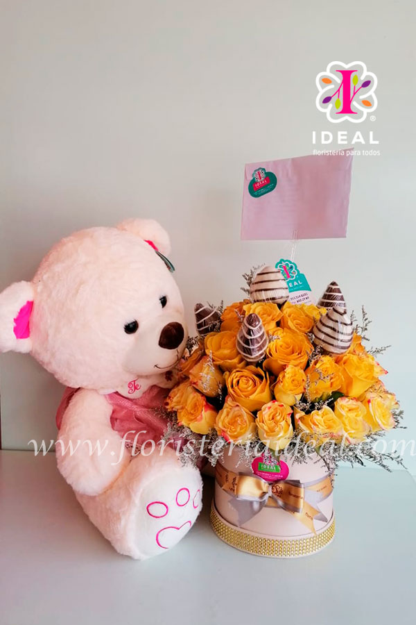Arreglo floral elaborado en rosas amarillas , acompañado por fresas de chocolate, peluche de 50cm y tarjeta para la ocasión.