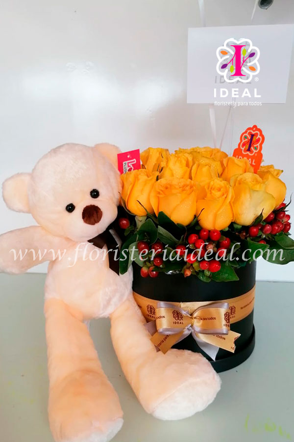 Delicado arreglo floral elaborado en bellas rosas amarillas, acompañado de delicado peluche y tarjeta para la ocasión.