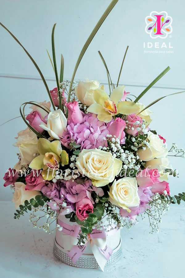 Caja redonda elaborada en rosas blancas, hortencia lila, delicadas orquideas y follajes verdes, incluye tarjeta para la ocasión