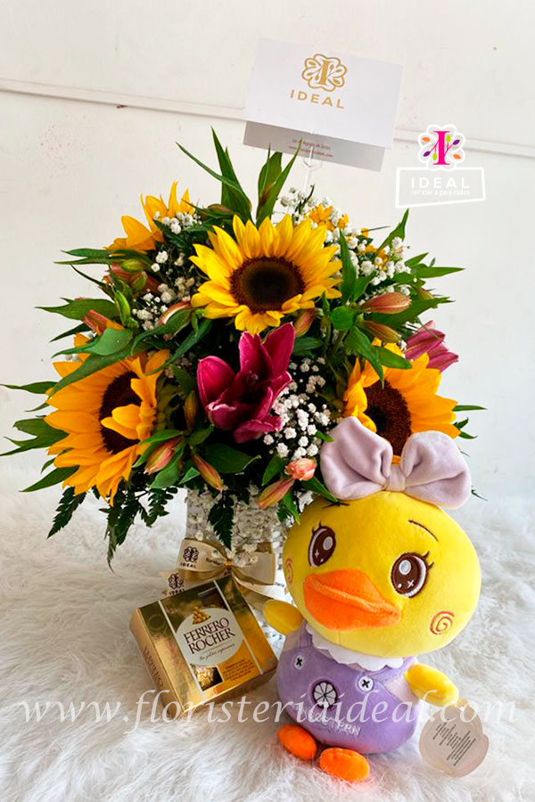 Delicado y hermoso arreglo floral de forma redonda elaborado en girasoles, lirios follajes etc. acompañado de tierno peluche , chocolates Ferrero Rocher con su respectiva tarjeta y mensaje deseado.