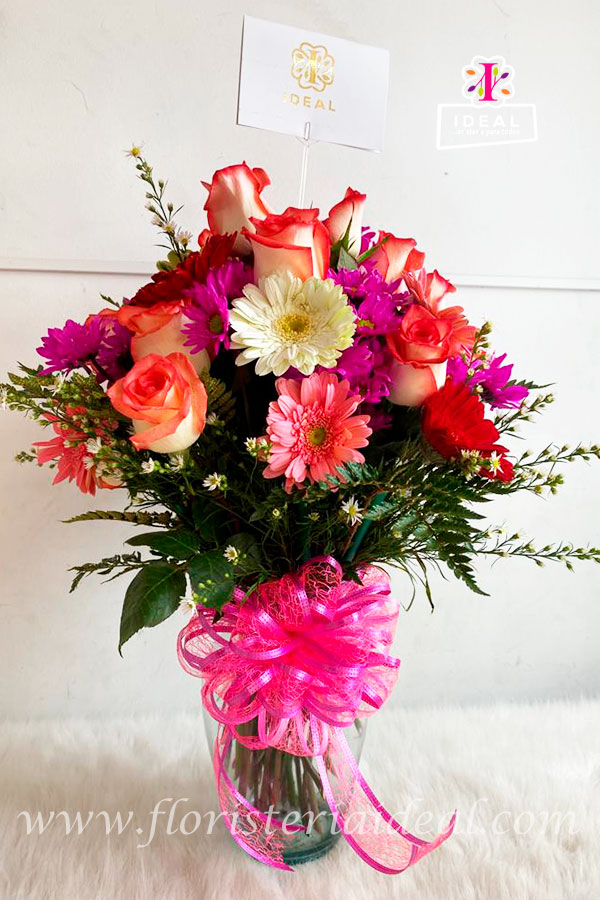 Hermoso jarrón floral redondo elaborado en gerberas, bellas rosas, margaritas y demás follajes acompañado de su respectiva tarjeta con mensaje deseado.
