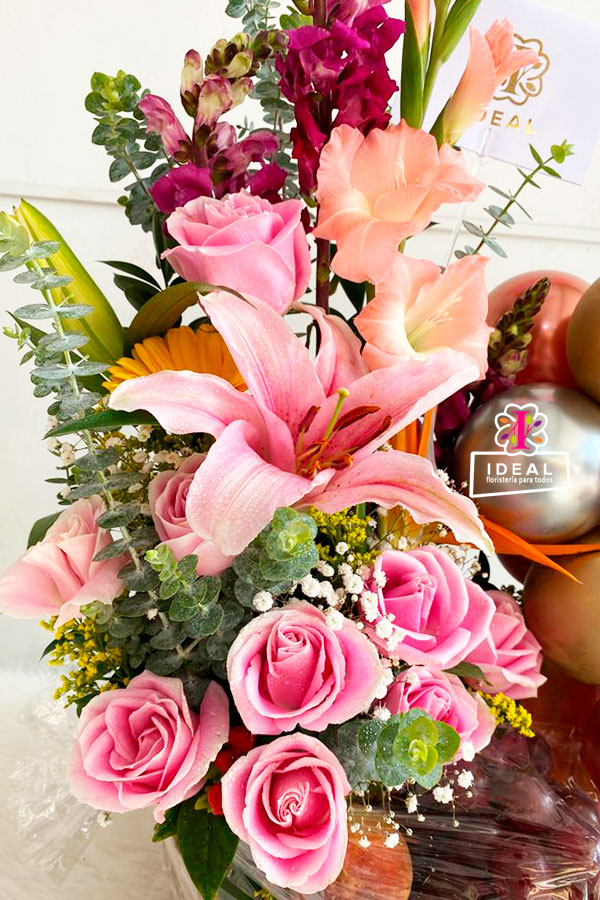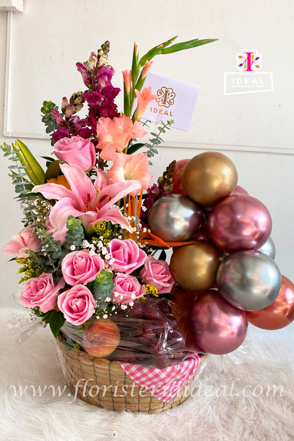 Bella ancheta de frutas surtidas acompañada de lindo arreglo floral y globos cromados este lindo arreglo incluye tarjeta para la ocasión.
