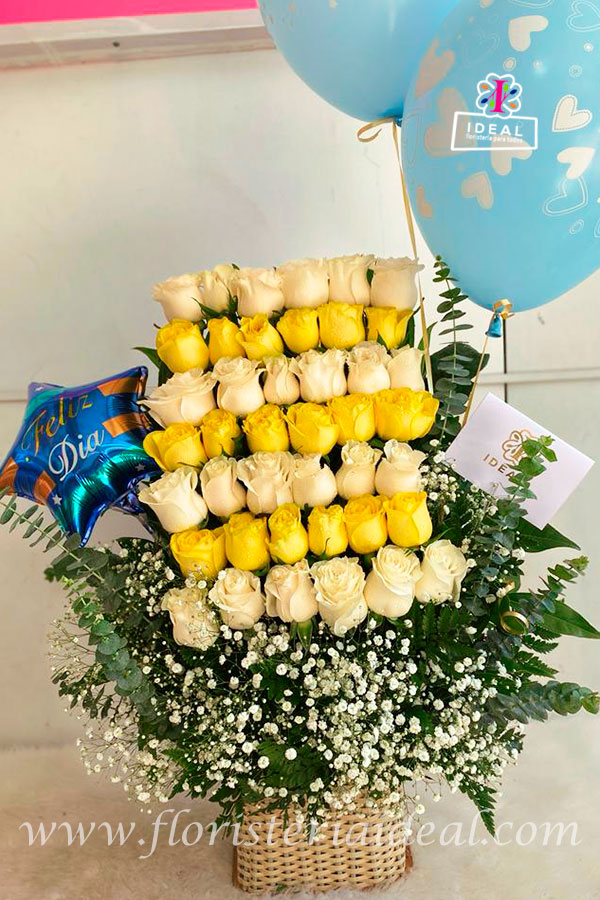 Hermoso ramo floral en rosas acompañado de globos en helio y metalizado ,acompañado de su respectiva tarjeta con mensaje deseado .