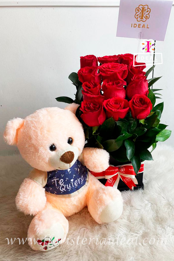 Delicada caja floral con rosas acompañado de tierno peluche y su respectiva tarjeta con mensaje deseado .
