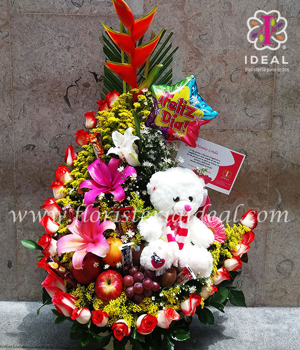 Acompaña este lindo dia de amor y amistad con este lindo regalo elaborado con hermosas rosas,lirios y bellos follajes acompañado de deliciosas frutas y ricos chocolates incluye tierna tarjeta con mensaje para esta linda ocasion.