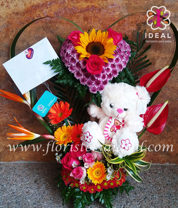 regala este tierno arreglo floral elaborado con lindas flore surtidas acompañado de bello peluche y linda tarjeta para esta tierna ocasion