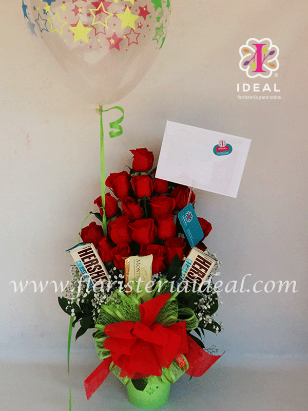 Delicado arreglo floral con rosas y chocolates acompa?ado de lindo lasito, globo, y tarjeta para esta linda ocasion.
