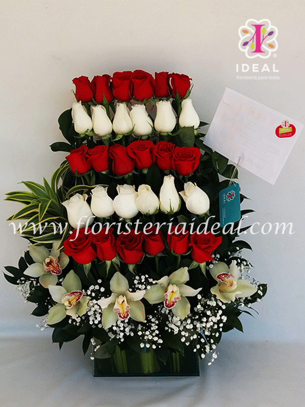 Bello arreglo floral elaborado en delicadas rosas y hermosas orquideas acompañado de finos follajes y delicada tarjeta para esta bonita ocasion. ( cantidad de rosas 30 unidades)