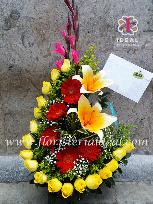 Tierno regalo de flores en forma de media luna acompa?ado de bellos lirios y tarjeta para esta bonita ocasion.