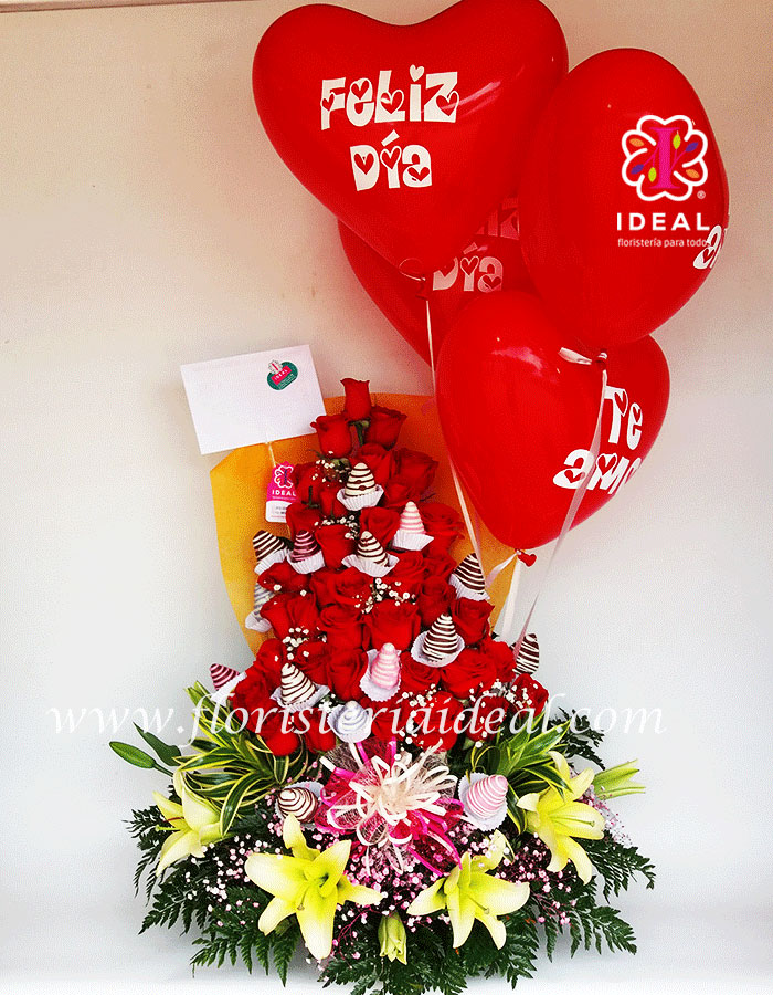 Sorprendente arreglo de rosas rojas, lirios de color follajes verdes esta acompañado de fresas con chocolates globos en helio y tarjeta para esta bella ocasión.