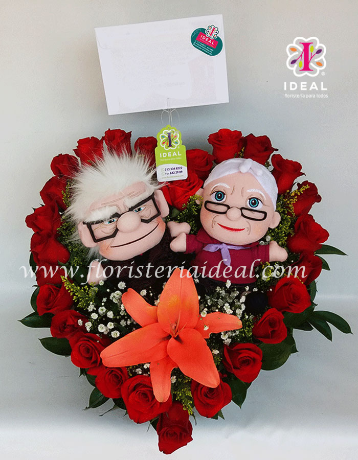 Delicado Arreglo de rosas en forma de corazón acompañado de hermosos abuelos de peluche +linda tarjeta para esta linda ocasión.