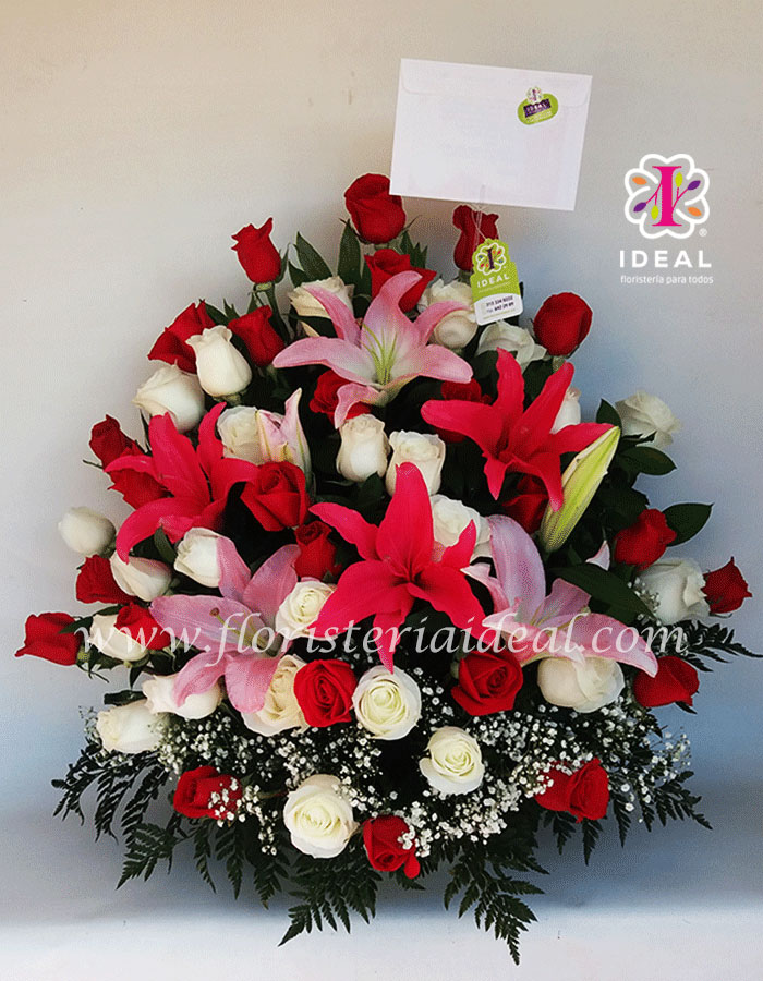 Delicado arreglo de rosas rojas y blancas acompañado de lindos lirios y bellos follajes verdes y blancos incluye tarjeta para la ocasión. (cantidad de rosas 40 rosas + 8 lirios)
