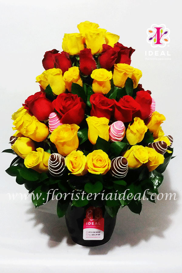Especial arreglo de rosas rojas y amarillas acompañadas de fresas bañadas en chocolate. ( cantidad de rosas 70 unidades y 15 unidades de fruchetas.)