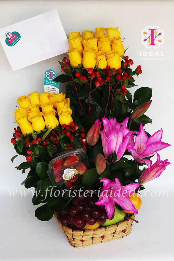 Delicado arreglo floral elaborado con hermosas rosas amarillas, lirios, y delicados follajes verdes esta acompañado de excelente calidad de frutas y tarjeta para es linda ocasión.