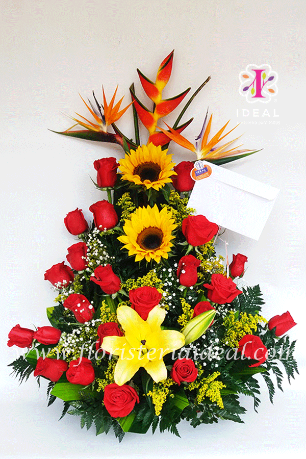 Lindo arreglo flora elaborado en delicadas rosas y bellas flores exóticas acompañado de linda tarjeta con mensaje para la ocasión.