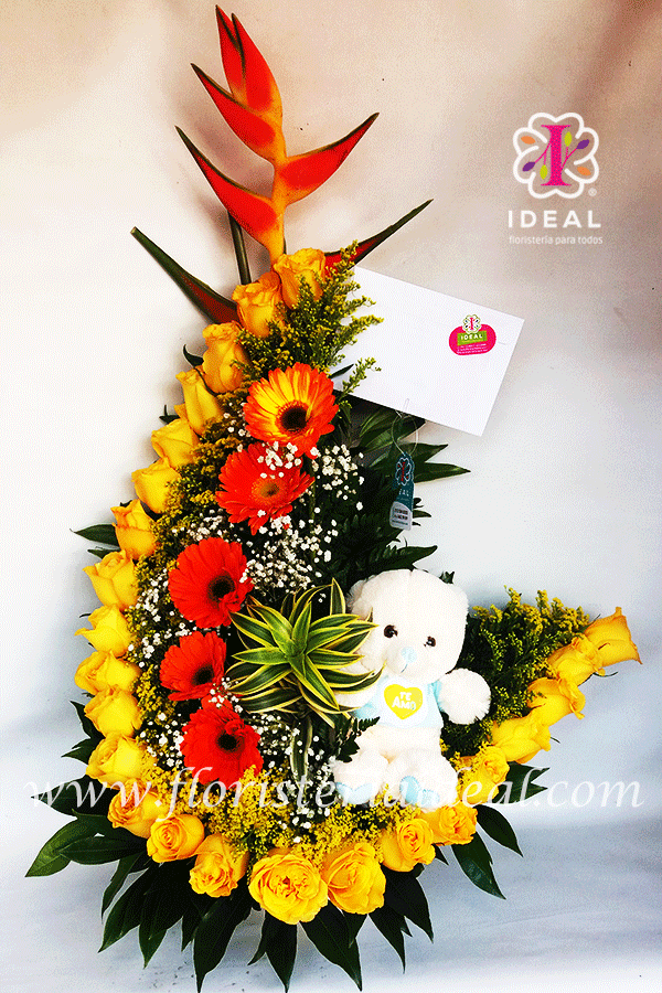 Bello arreglo floral elaborado en hermosas rosas de color amarillas,lindas gerbera y elegantes follajes verdes acompañado de tierno osito de peluche y tarjeta para la ocasión.