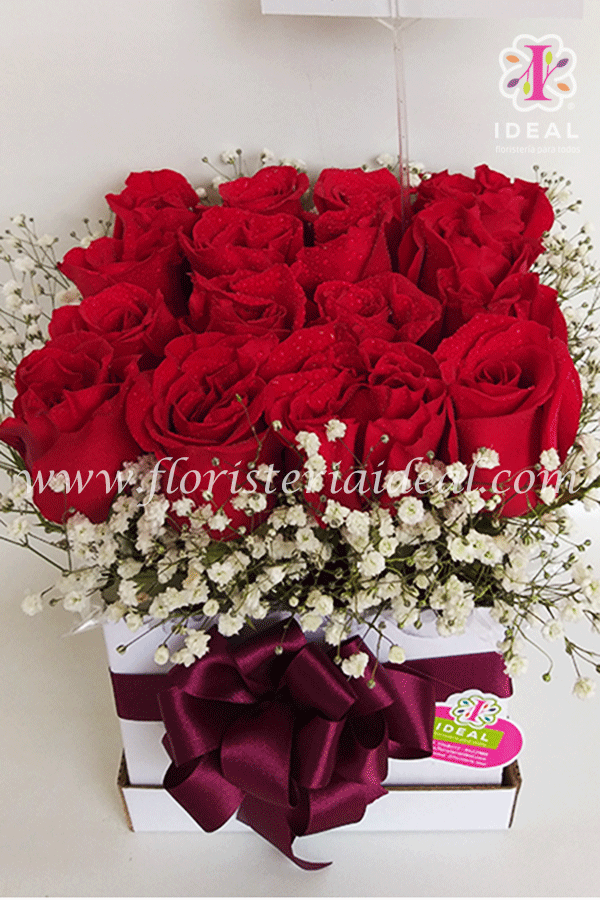 Cajita de rosas rojas acompañada de tiernos follajes blancos y lasito de decorativo incluye tarjeta para esta linda ocasión. (cantidad de rosas 16 unidades)