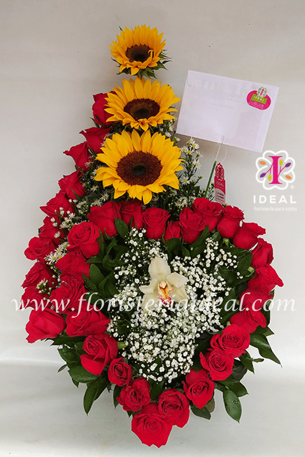 Delicado arreglo de rosas rojas acompañado de lindos girasoles y delicados follajes verdes y blancos incluye bonita tarjeta para esta linda fecha. (lo acompaña una bella orquídea)