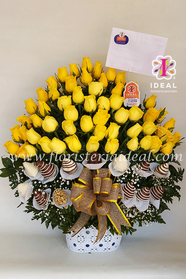 Especial arreglo floral de rosas acompañado de fresas bañadas en delicioso chocolate y delicados follajes verdes y blancos incluye tierna tarjeta para esta linda ocasión(cantidad de rosas 50 unidades)