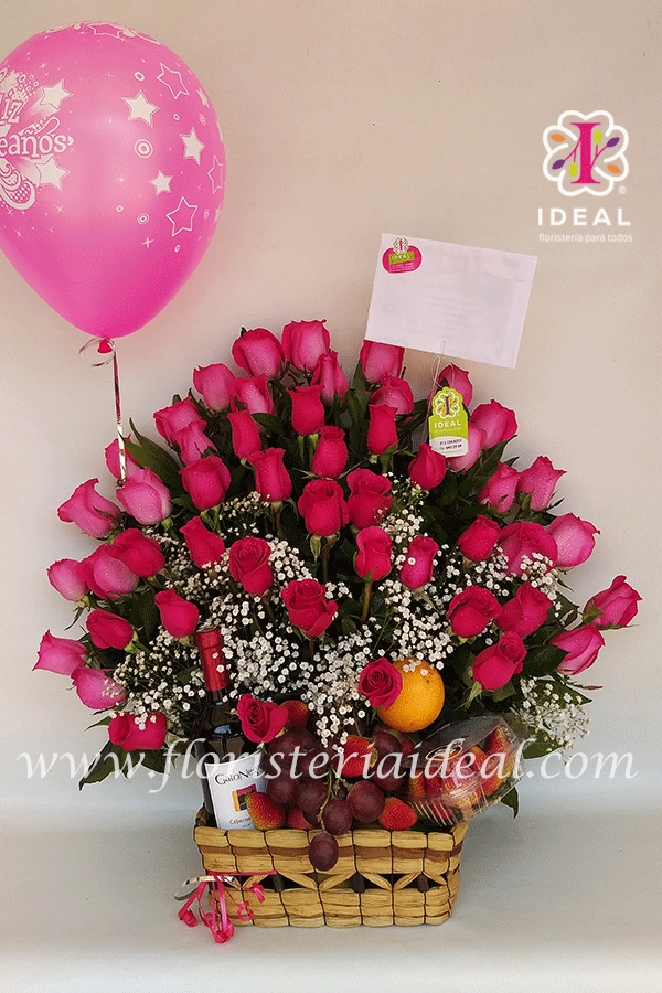 Bello arreglo floral de lindas rosas fucsia y delicados follajes verdes y blancos esta acompañado de una gran variedad de deliciosas frutas y especial vino gato negro + globo en helio y tarjeta para esta linda ocasión,
