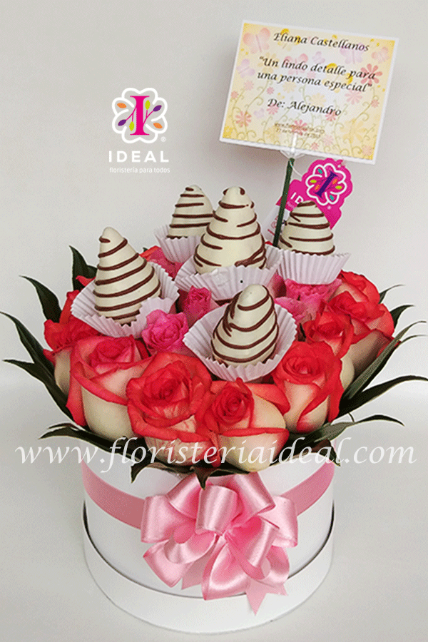caja de rosas rosadas acompañado deliciosas fruchetas y linda tarjeta para esta linda ocasión.