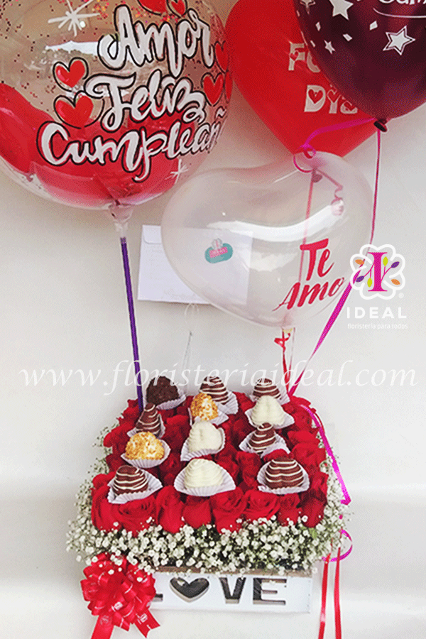 Especial arreglo de rosas rojas acompañado de deliciosas fresas bañadas en chocolate "fruchetas" incluye lindos globos en helio y uno personalizado + tarjeta para la ocasión. (cantidad de rosas 60 unidades)