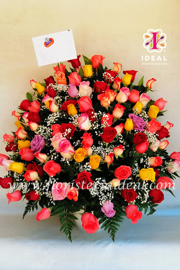 Especial arreglo floral elaborado en bellas rosas de colores acompañado de hermosos follajes linda tarjeta para la ocasión (cantidad de de rosas 90 unidades)