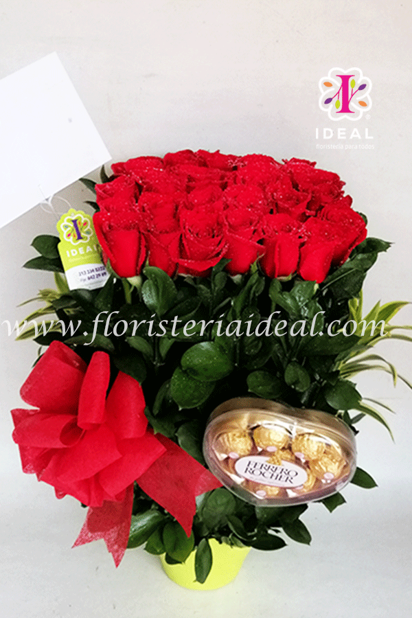 Delicado arreglo floral elaborado en bellas rosas rojas esta acompañado de bellos follajes y deliciosos chocolates ferreros rocher y tarjeta para la ocasión