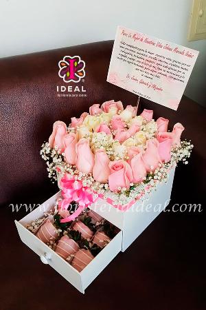 Bello estuche de rosas acompañado con deliciosas fruchetas