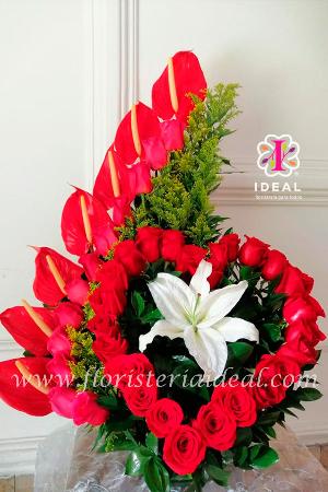 Delicado arreglo floral elaborado en rosas y lindos anturios esta acompañado de tarjeta para la ocasión