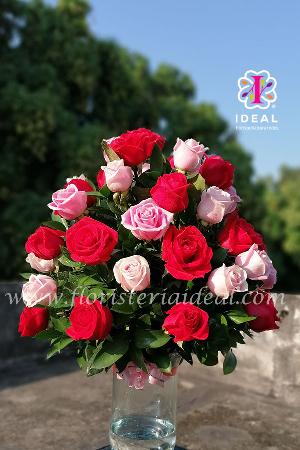 Arreglo floral de forma redonda elaborado en bellas rosas y follajes verdes su base es un jarrón tipo samaritano incluye tarjeta para la ocasión.