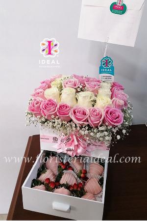 Delicada caja de lindas rosas acompañada de fresas bañadas en chocolates especial para un lindo regalo.
