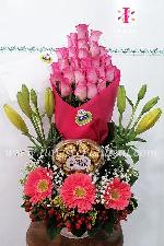 Delicado arreglo floral elaborado el bellas rosas y lindos lirios acompañado de estuche de chocolates ferreros y tarjeta para la ocasión,