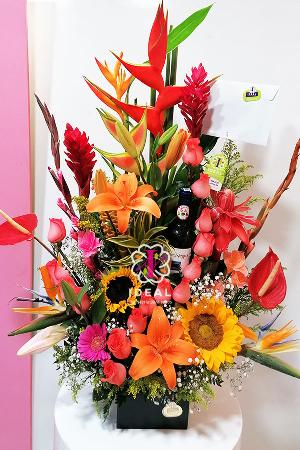 Arreglo floral elaborado con lindas flores surtidas y delicados follajes esta acompañado de delicioso vino y tarjeta para la ocasión