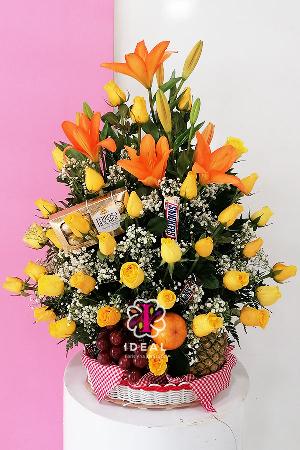 Especial arreglo floral acompañado de frutas surtidas y tarjeta para la ocasion.