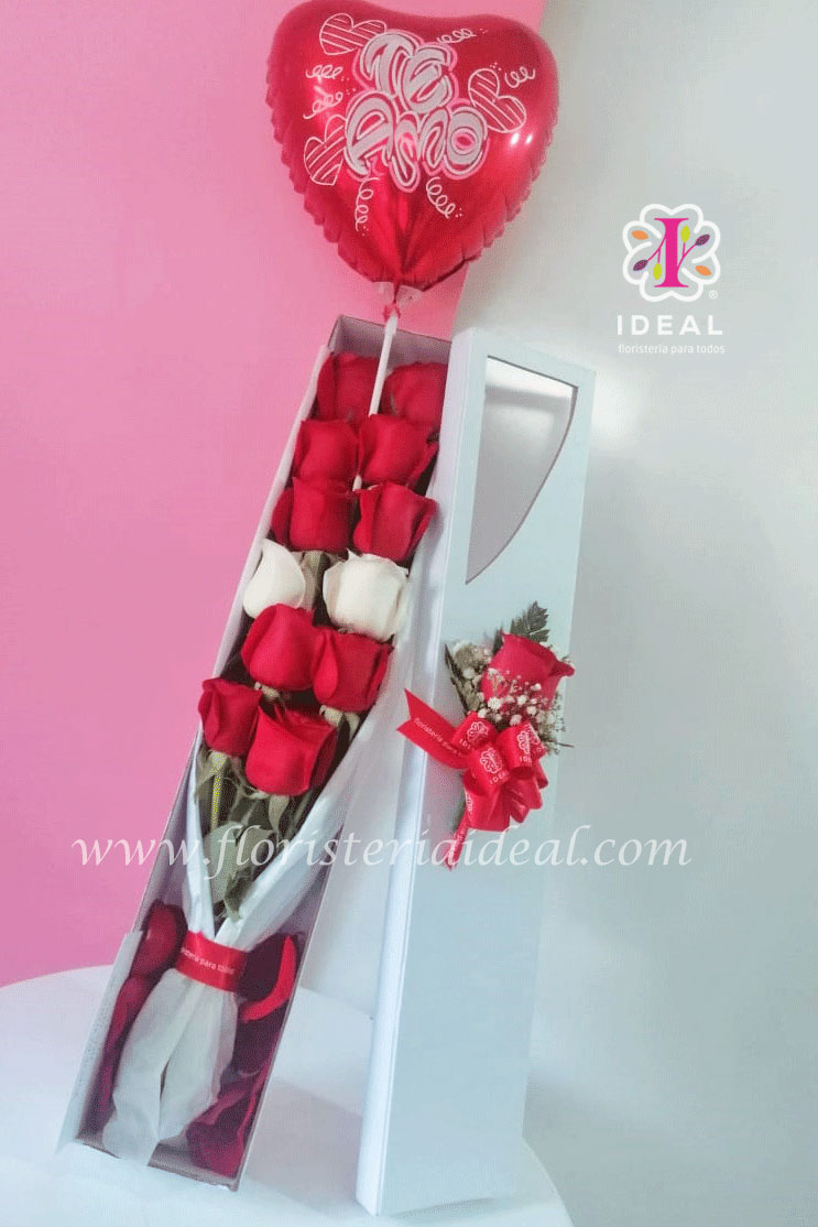 Linda caja alargada elaborada en bellas rosas acompañada de globo metalizado y delicado moño, incluye tarjeta para la ocasión