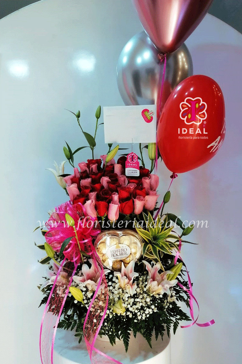 Arreglo floral elaborado en bellas rosas, lirios y delicado follaje, incluye deliciosos chocolates ferrero rocher en su presentación de 8 unidades en forma de corazón, globos en helio y tarjeta para la ocasión