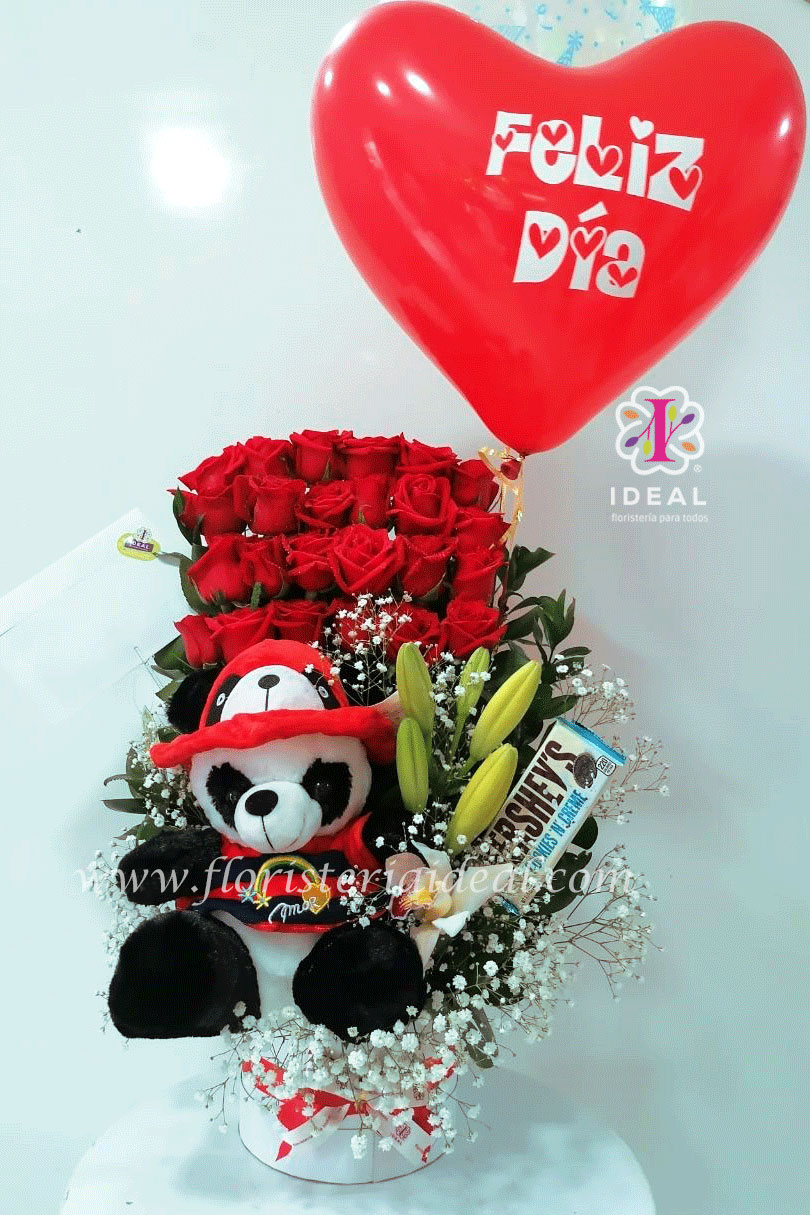 Lindo arreglo floral en forma de escalera elaborado en rosas, lirios y follaje, viene acomapañado por un tierno oso, chocolates Hersheys, Globo en Helio y tarjeta para la ocasión