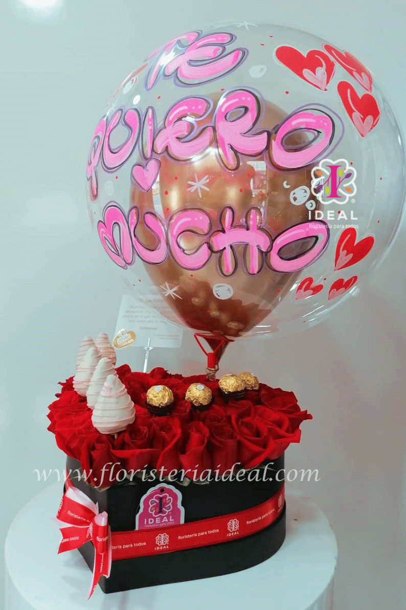 Especial caja en forma de corazón elaborada en bellas rosas rojas acompañada de Ricos Chocolates Ferrero Rocher y Fresas cubiertas de chocolate, incluye lindo globo personalizado, moño y tarjeta para la ocasión