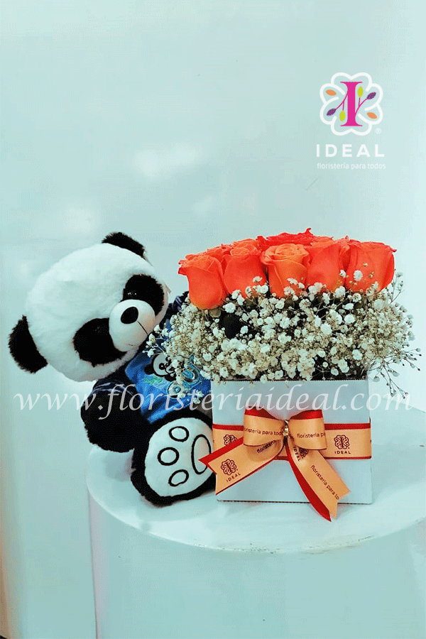 Linda caja de rosas acompañada de follaje blanco y peluche, incluye tarjeta para la ocasión