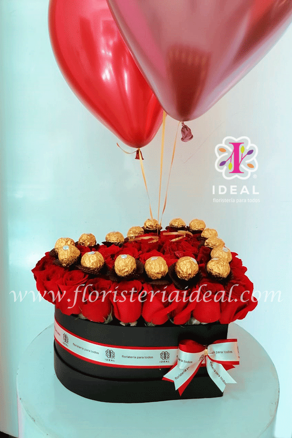 Bella caja de rosas en forma de corazón acompañada de deliciosos chocolates ferrero rocher, incluye 2 globos en helio y tarjeta para la ocasión. Cantidad de Chocolates: 16