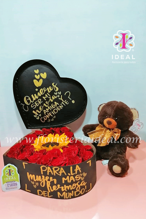Delicado arreglo floral elaborado en cajita de corazón con representativo mensaje personalizado, acompañado de lindo oso de peluche, incluye tarjeta para la ocasión