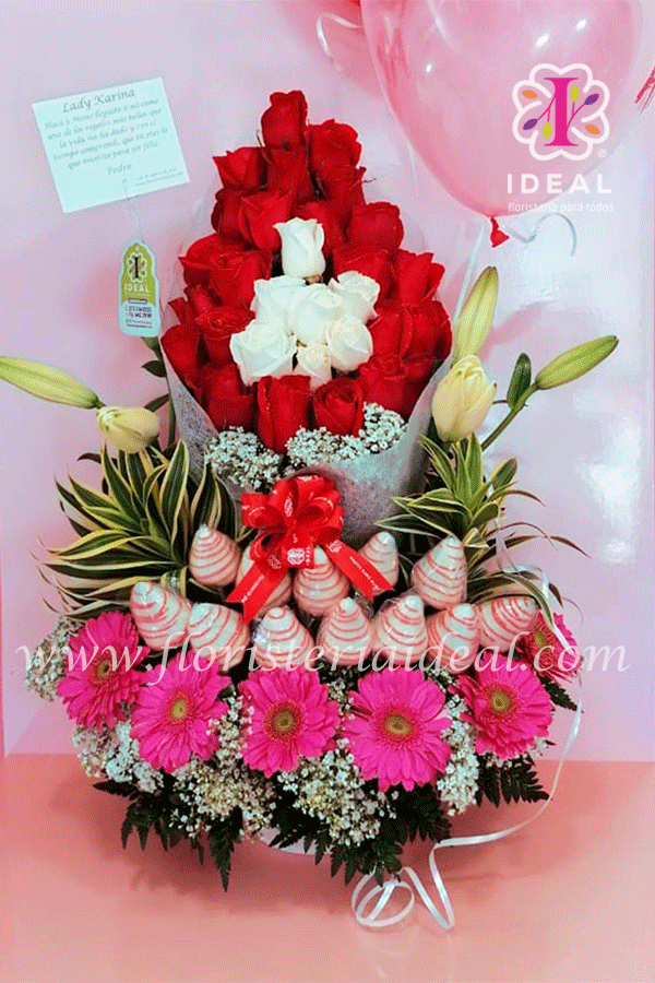 Lindo arreglo floral elaborado en bellas rosas y delicados follajes blancos, acompañado por deliciosas fresas de chocolate.